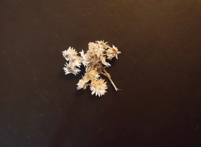 I picked this little flower and it became a souvenir and carrier of memories of all the things that had happened. It reminded me of the atmosphere, the energy – the entire experience really. The rice and the seed pods are part of the rituals, and I have difficulties relating to the significance of the rituals, but the flower is not part of the rituals. It is the bloom of the experience’.